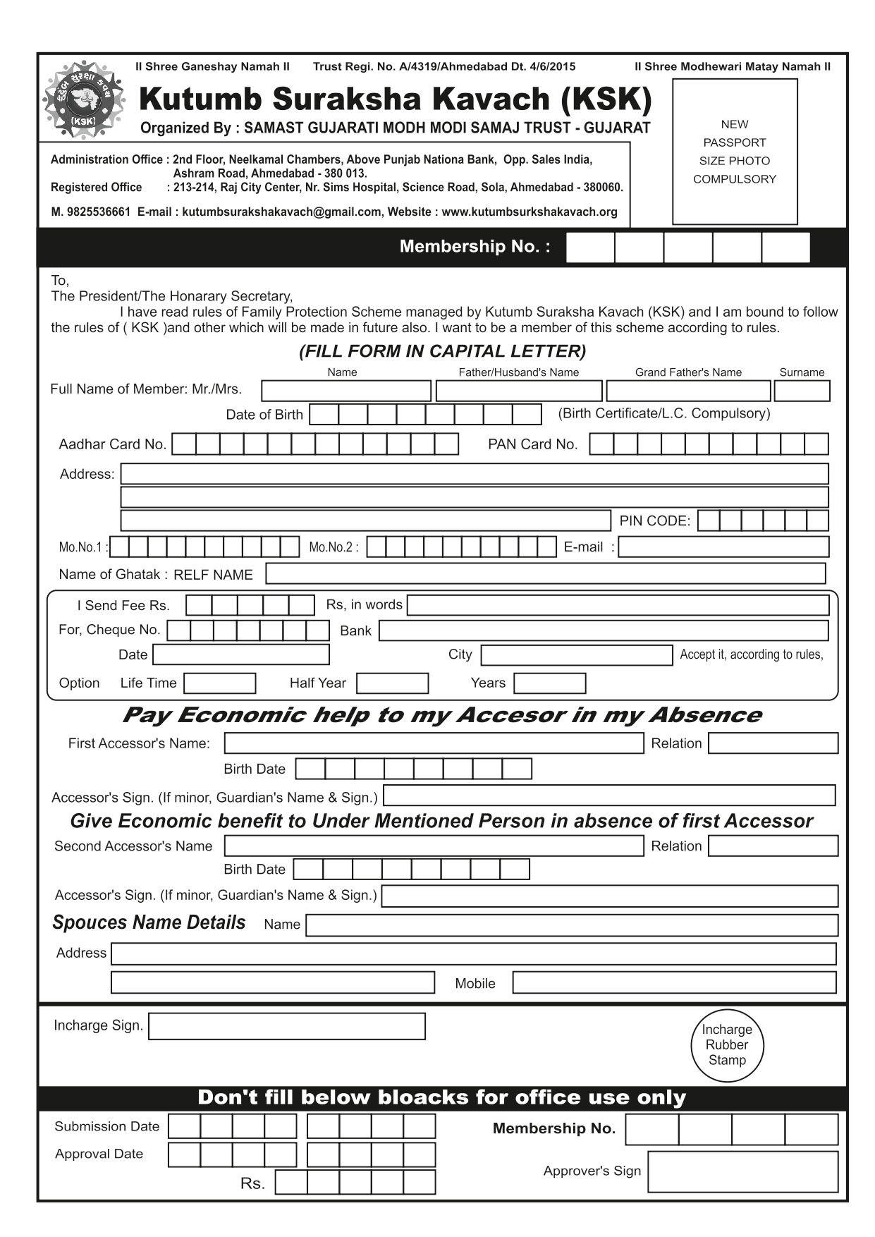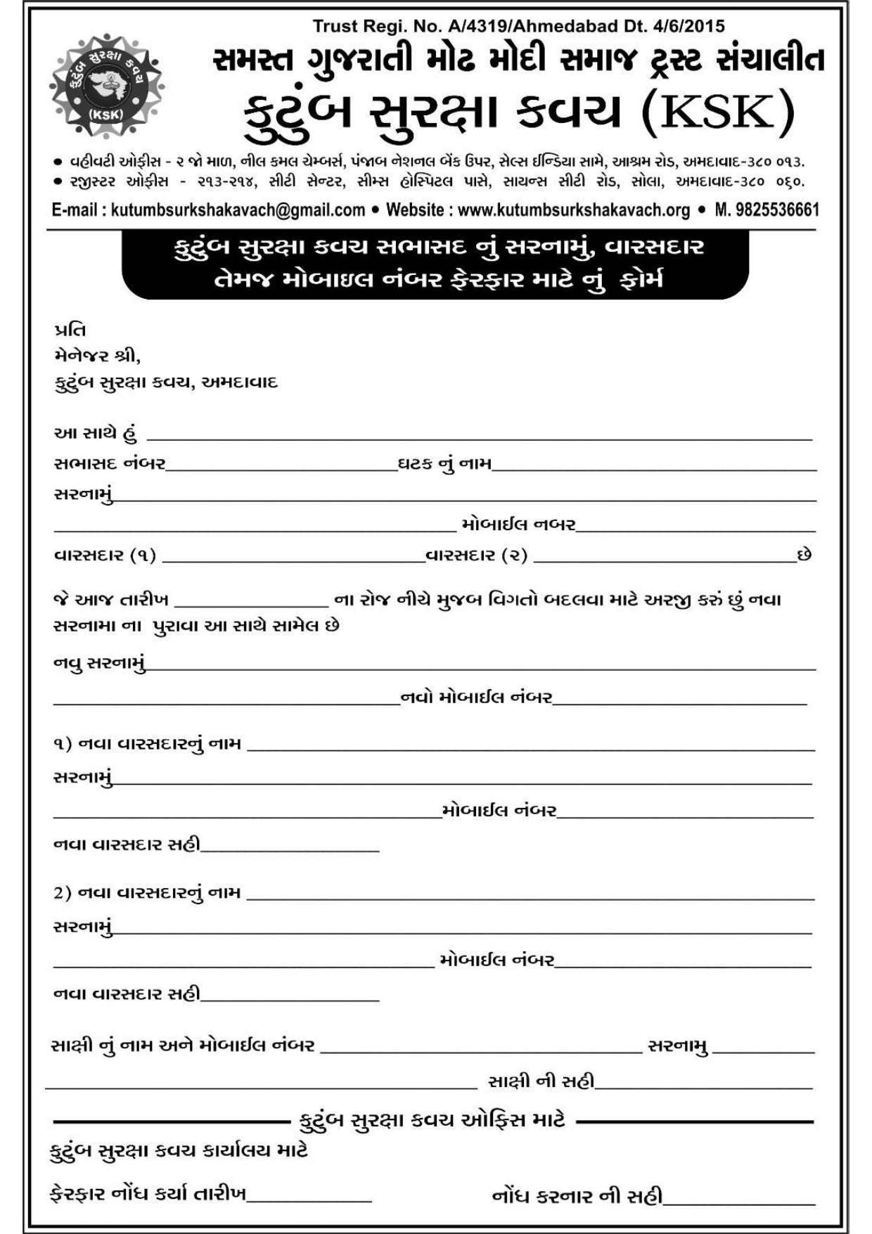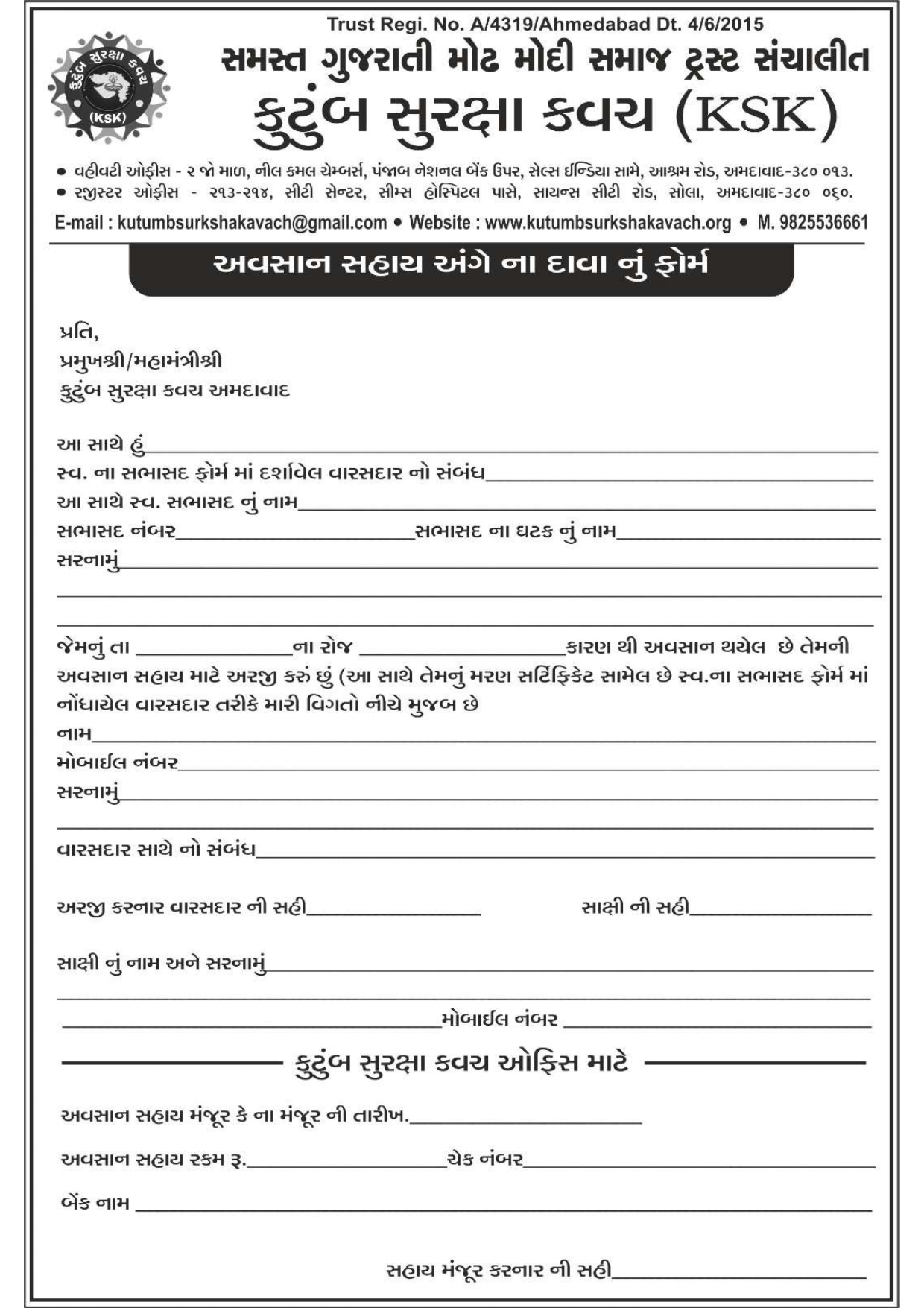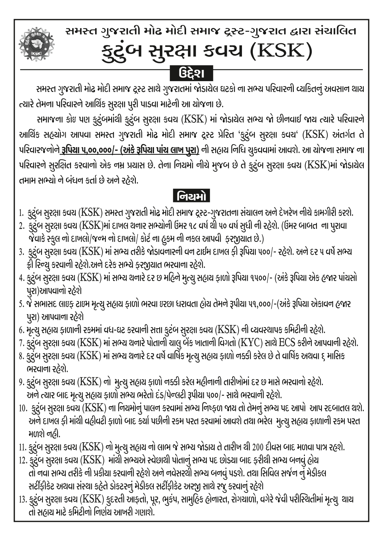 “કુટુંબ સુરક્ષા કવચ” ઉમદા કાર્યથી ટ્રસ્ટની સમાજ સેવાની પ્રવૃતિના શ્રી ગણેશ થયા. ટ્રસ્ટના રજીસ્ટર્ડ સ્ભ્યના આકસ્મિક મૃત્યું સમયે પરિવારને ‘શ્રદ્ધાંજલી ફાળાની રકમ’ પ્રાપ્તિ પરિવારના સ્વમાન અને આર્થિક વળતર બંને ઉદ્દેશો સાચવશે. યોજનાની વધુ વિગત યોજના અંગેની માહિતી તથા ટ્રસ્ટના ટ્રસ્ટી, હોદ્દેદારો, કારોબારી સભ્યો અને પ્રતિનિધિઓ ની માહિતી સંપર્કના ઉદ્દેશથી રજુ કરી છે.
